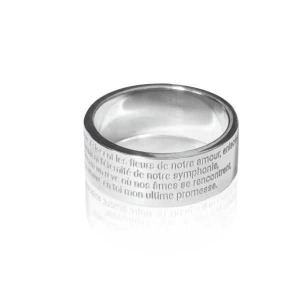 Votre chanson, citation ou poème préféré s’enroule autour de votre doigt pour constituer votre bague unique et intime.